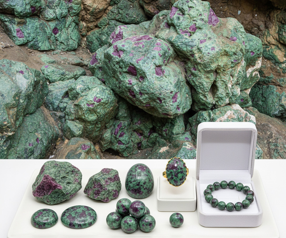 Ein Calcium-Aluminium-Silikat. Meistens ist er kräftig grün mit schwarzen Hornblende-Einschlüssen und manchmal roten Rubinpunkten.