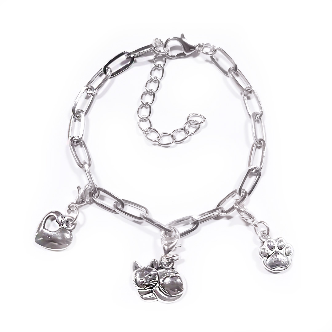 Dieses versilbertes Glieder-Armband  kommt mit  drei Themen-Charm-Anhängern inklusive. In die Kette können wahlweise weitere Charms eingefügt werden. Mit einem dekorativen Karabinerverschluss mit Verlängerungskettchen lässt sich das Armband öffnen.