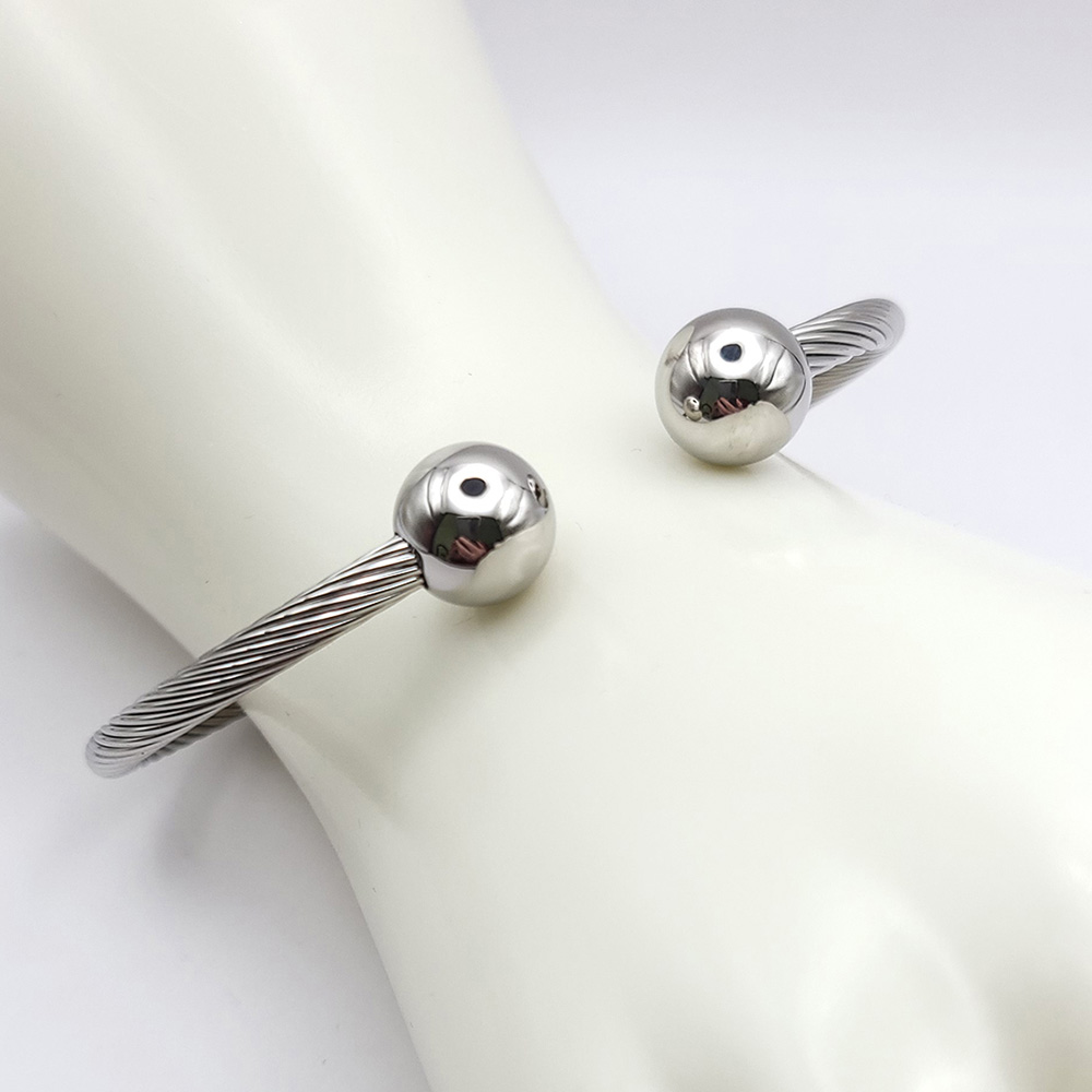 Dieser Armreif aus gedrehten Stahlseilen umarmt das Handgelenk und vermittelt ein Gefühl von Zuverlässigkeit. Der Armreif besteht aus medizinischem Edelstahl und ist nickelallergenfrei.