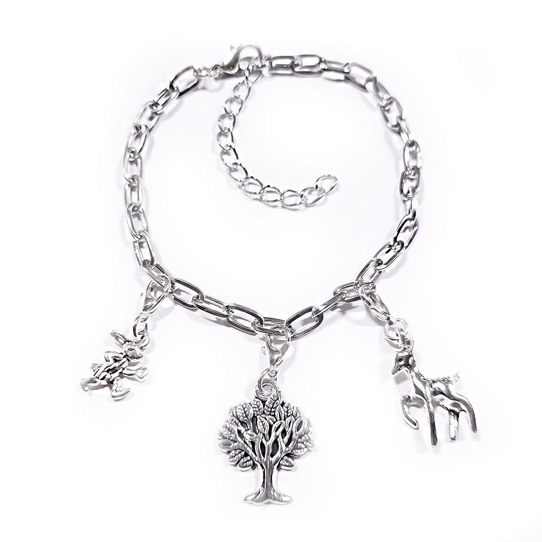 Dieses versilberte Glieder-Armband  kommt mit  drei Themen-Charm-Anhängern inklusive.